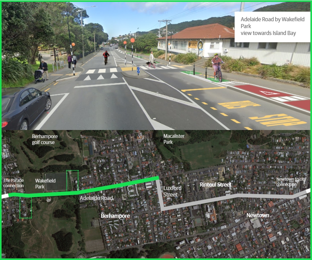 - separated uphill southbound bike lane on Adelaide Road from Chilka Street to the start of Wakefield Park (at 559 Adelaide Road)