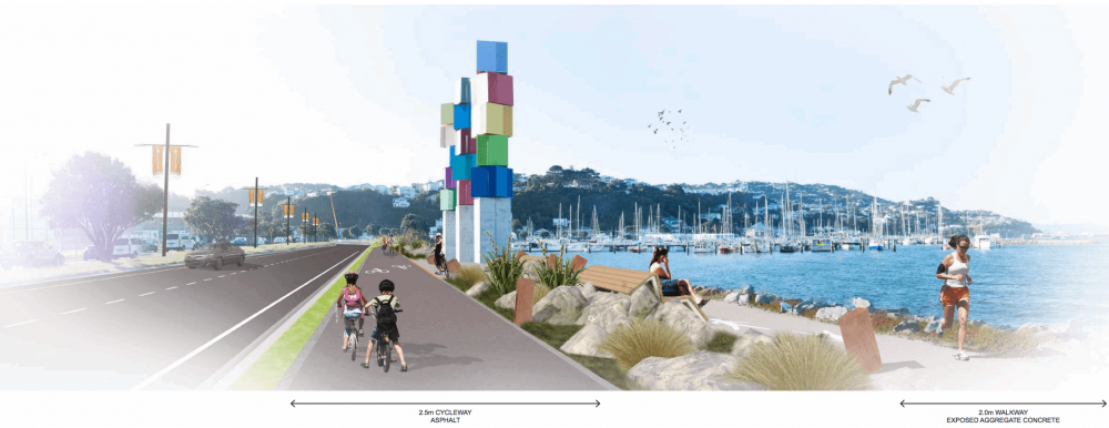 - Next to Evans Bay marina, the little beach area will be more attractive and easier to get to. Several trees near the Zephyrometer wind sculpture will be moved close by to make space for the new paths.