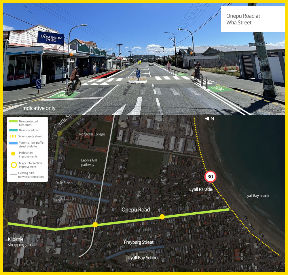 - Safer bike route from Rongotai Road to Lyall Parade with separated bike lanes on both sides of Onepu Road except for a 100m shared bike and bus lane southbound near the bus barns and the section south of Wha Street