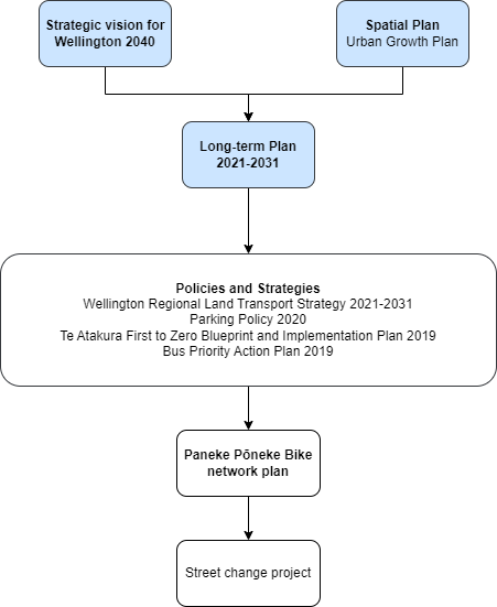 In line with Council strategies, policies, and plans, we have developed Paneke Pōneke, a citywide bike network plan. Changes as part of Paneke Pōneke will happen alongside improvements for people walking, scooting, and taking the bus.