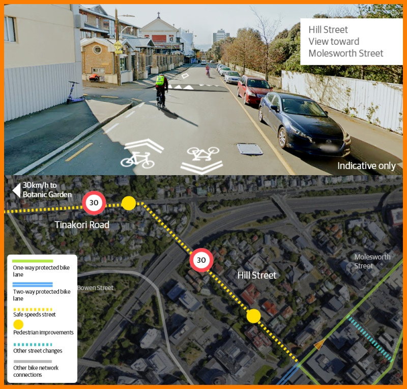Changes in this area include improvements for people walking and biking on Tinakori Road and Hill Street.