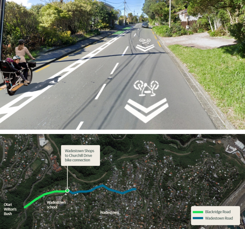There will be an uphill bike lane on Blackbridge Road from Churchill Drive to Wadestown Road. On-street parking on the uphill side will be removed, as well as on part of Wilton Road. Some parking on the downhill side will be retained. This will complete the Wadestown biking connection between Crofton Downs, Wilton and the central city.