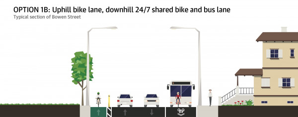 - Uphill separated bike lane, downhill shared bus and bike lane