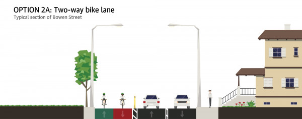 - Two-way bike lane – removal of parking, more space for urban design improvements