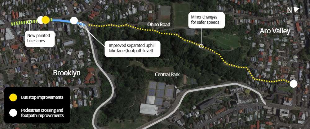 - Create a safer shared on-road bike route downhill via Ohiro Road to Aro Street with six new speed humps and improved road markings to encourage safer speeds
