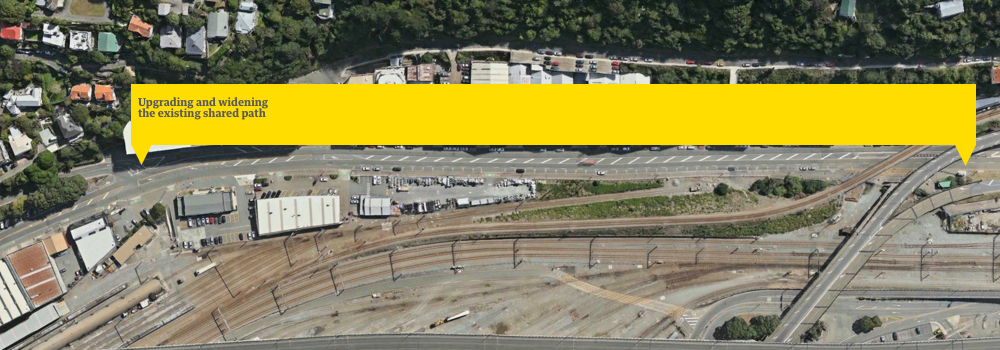 We have widened and upgraded the shared path between Aotea Quay overbridge and Tinakori Road intersection, to create separate biking and walking paths using the Council-owned road reserve land alongside the old shared path.
