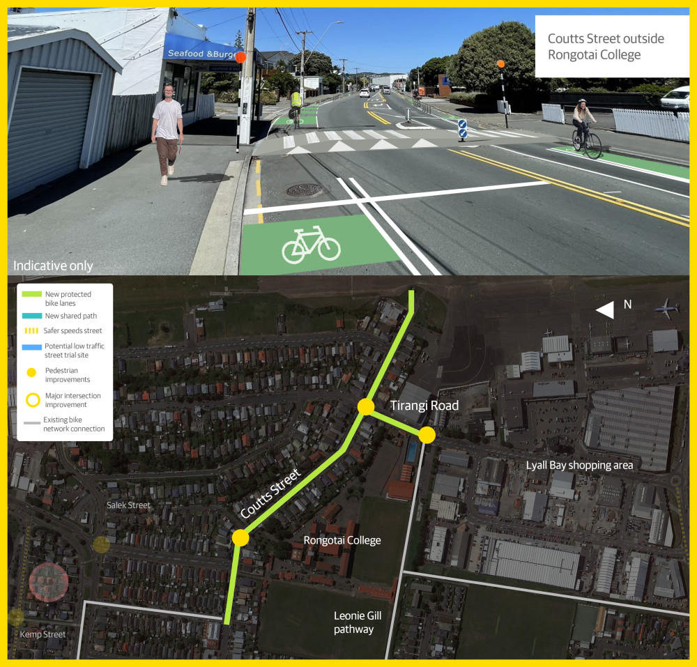 - New street layout with separated bike lanes on both sides of Coutts Street from Te Whiti Street to the Tirangi Road roundabout