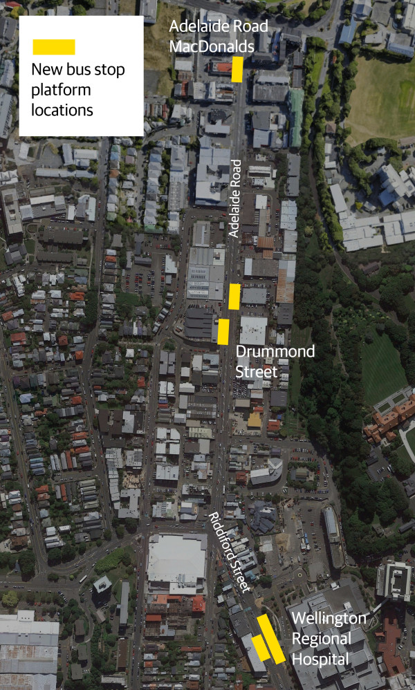 - Relocating loading zone for businesses on corner of Adelaide Road and Riddiford Street to the Hospital car park entrance, with P10 loading during off-peak hours 7pm-7am in the lane