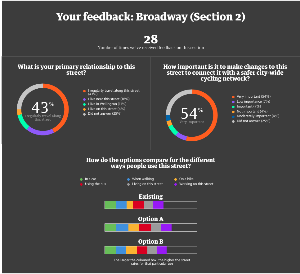 The Broadway route has two sections: Miro Street (via the shared path under the airport runway) to Strathmore shops; and Strathmore shops to Seatoun Tunnel. Options were put forward for community feedback in September 2017.